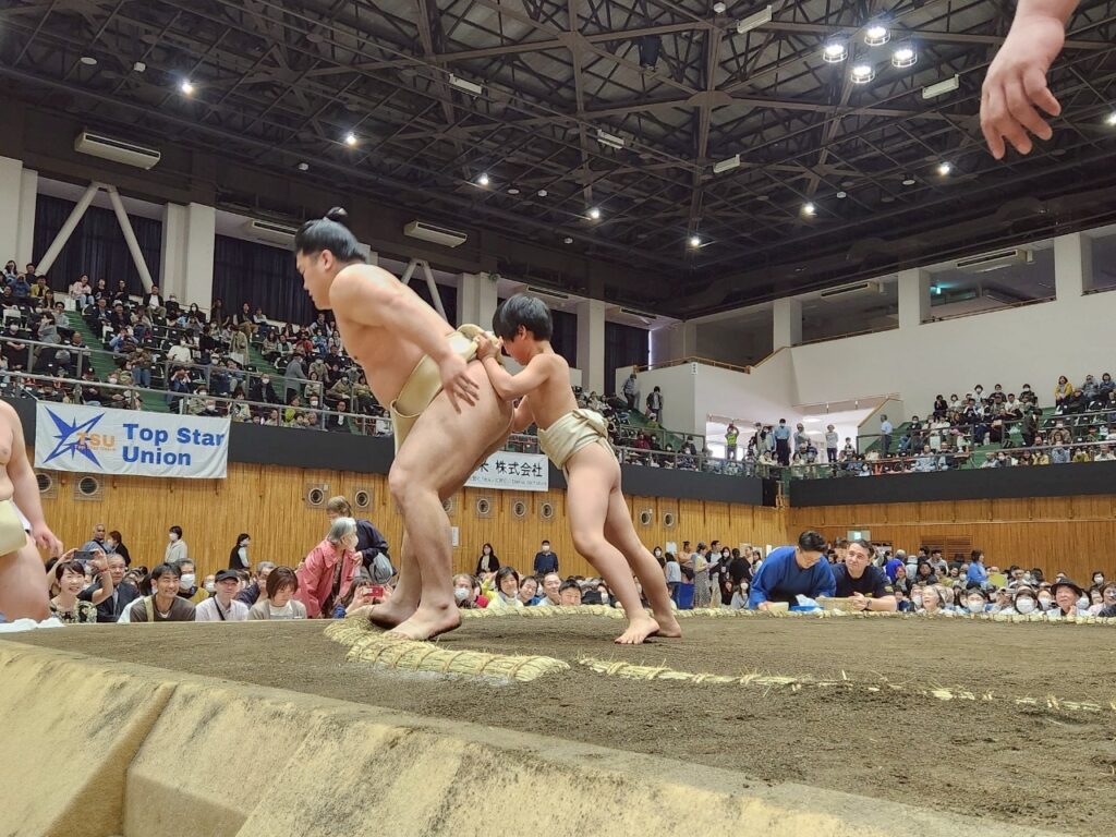いよいよ本番が始まり、学年順に小さい選手から胸を借ります。まずは筋肉隆々の朝紅龍関に挑戦し押し出すことができました。