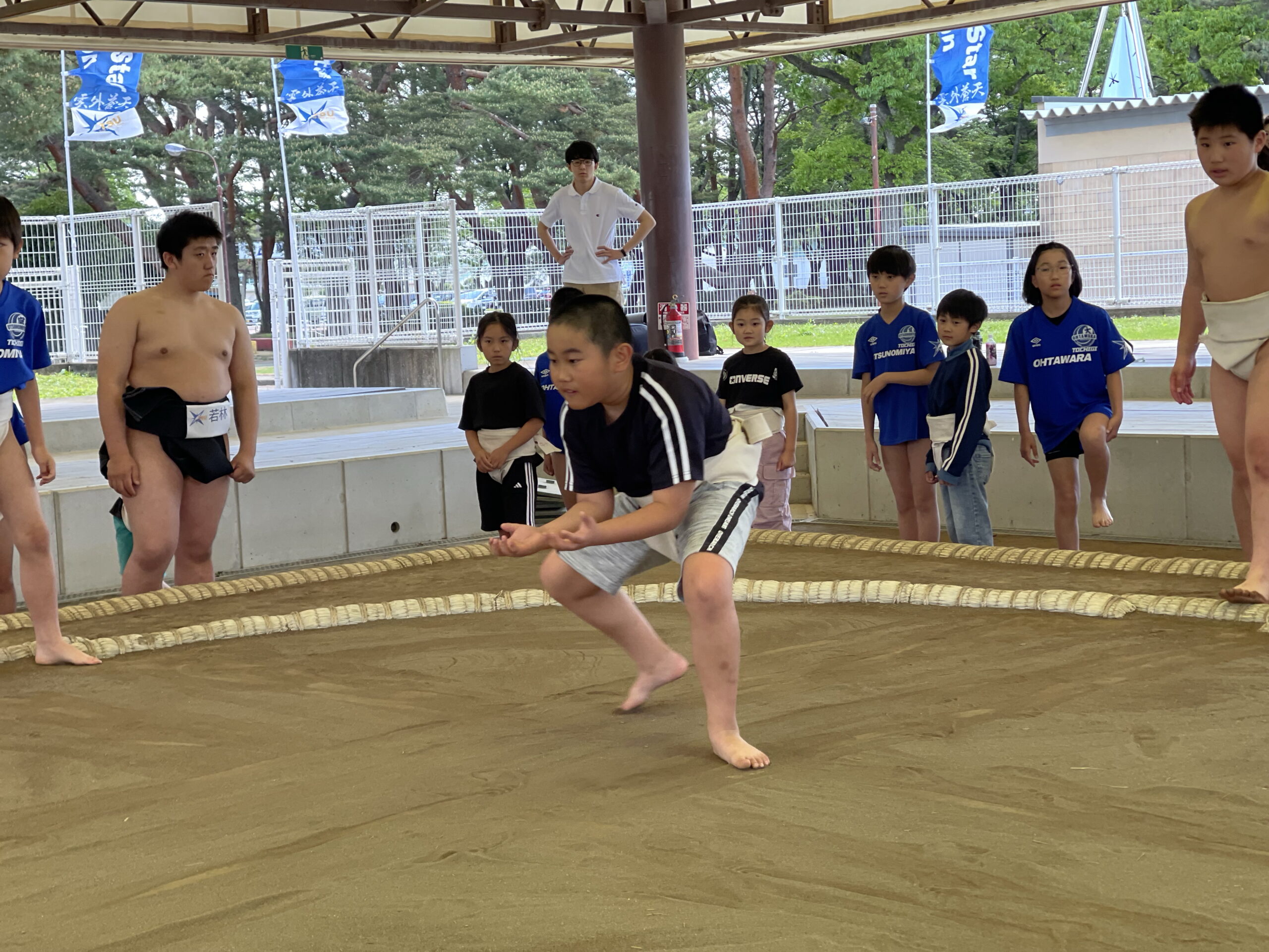 はじめて土俵を見る子やまわしを巻いたことがない子でもスタッフが一から教えてくれます。抵抗のある子はズボンやTシャツを着たまま巻いても大丈夫です!