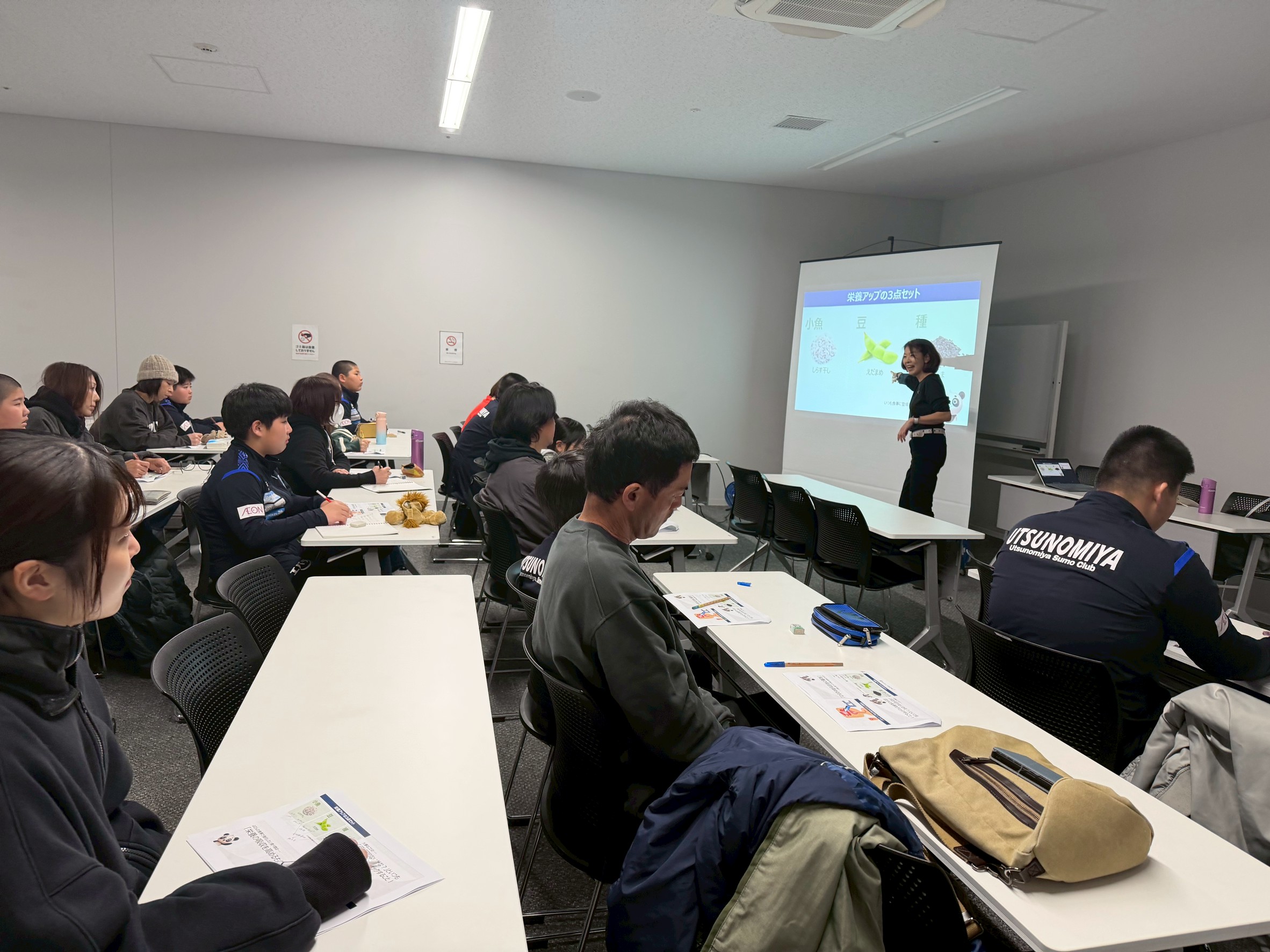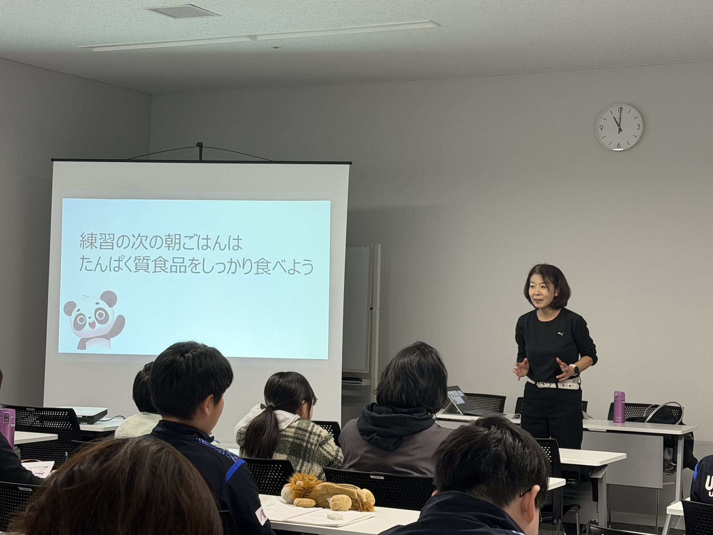 TSUの選手は冬季の3ヶ月で10kgの増量を目標に取り組んでいます。目標達成に向けた食事方法について、日本スポーツ協会公認栄養士の鈴木いづみ先生による講演をいただきました。